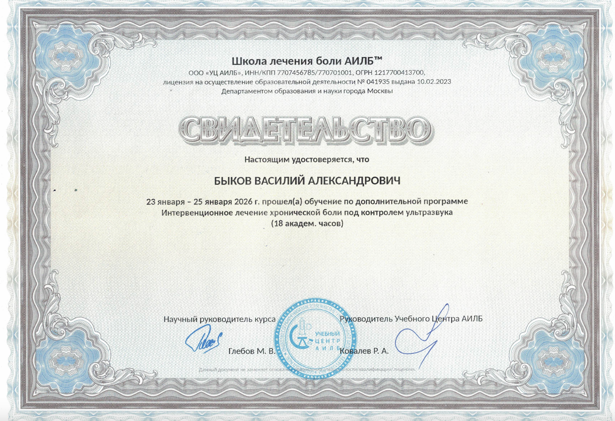 18.10.2018г. по специальности «мануальная терапия»;