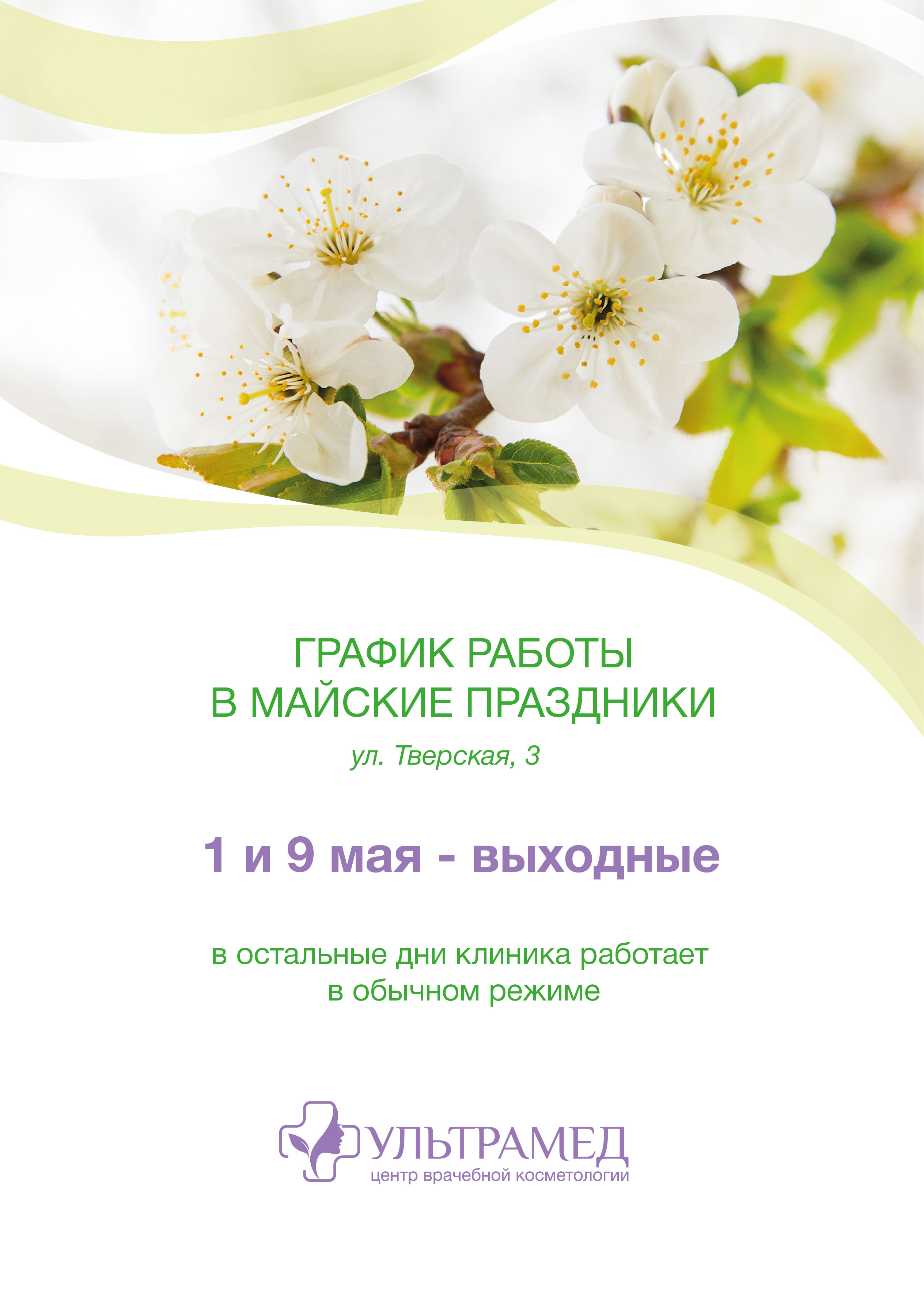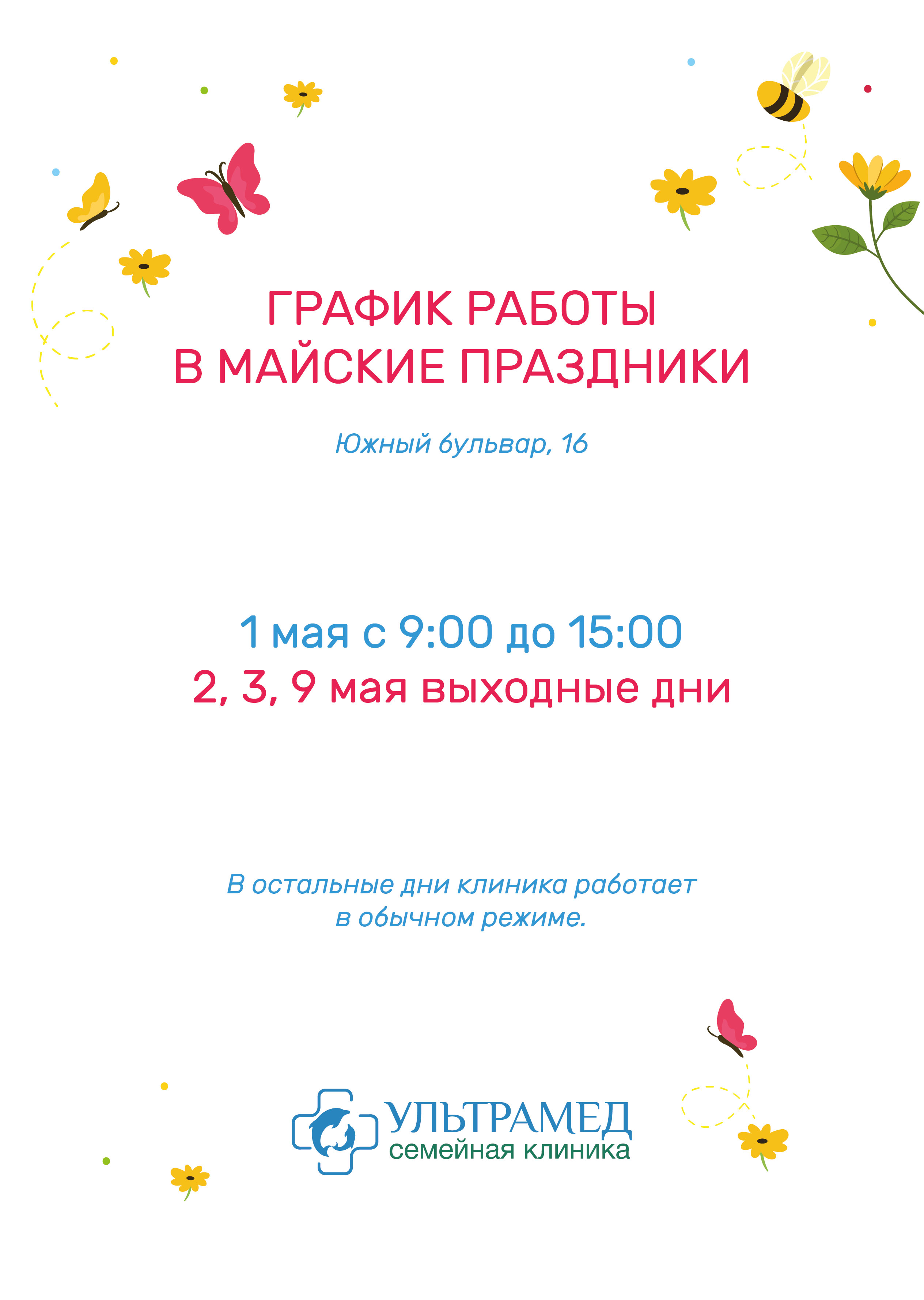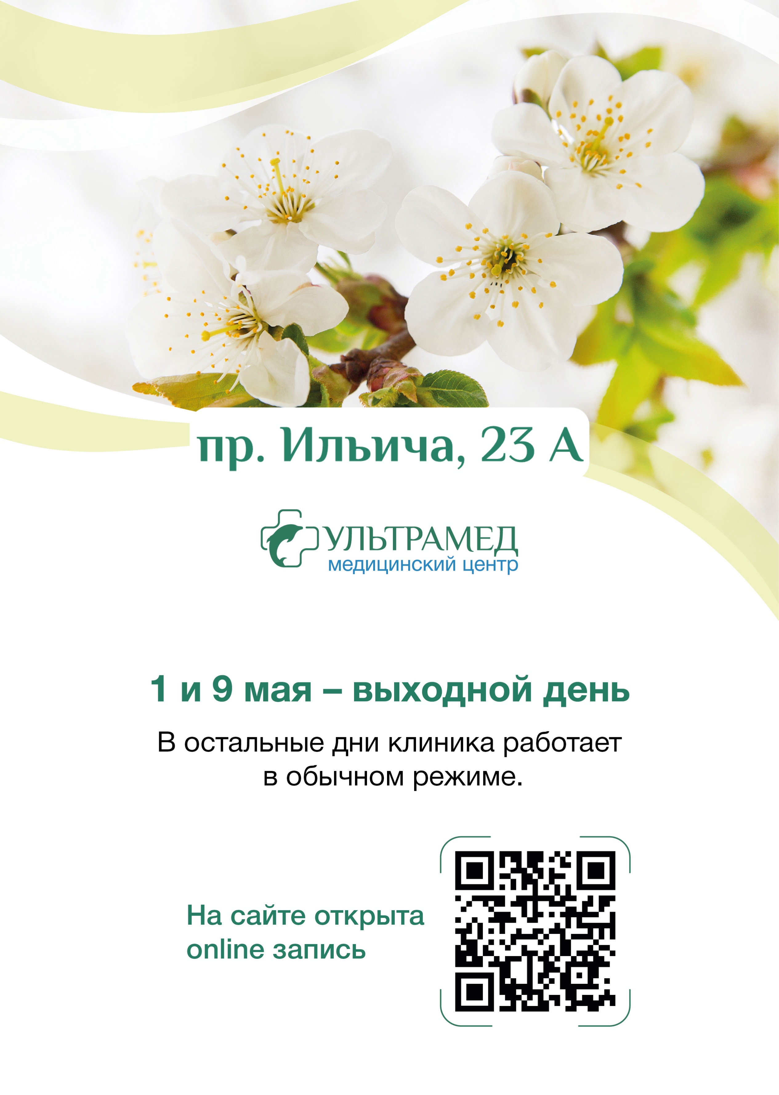 Уважаемые пациенты, ознакомьтесь с режимом работы сети клиник «УльтраМед» на майские праздники 2026.