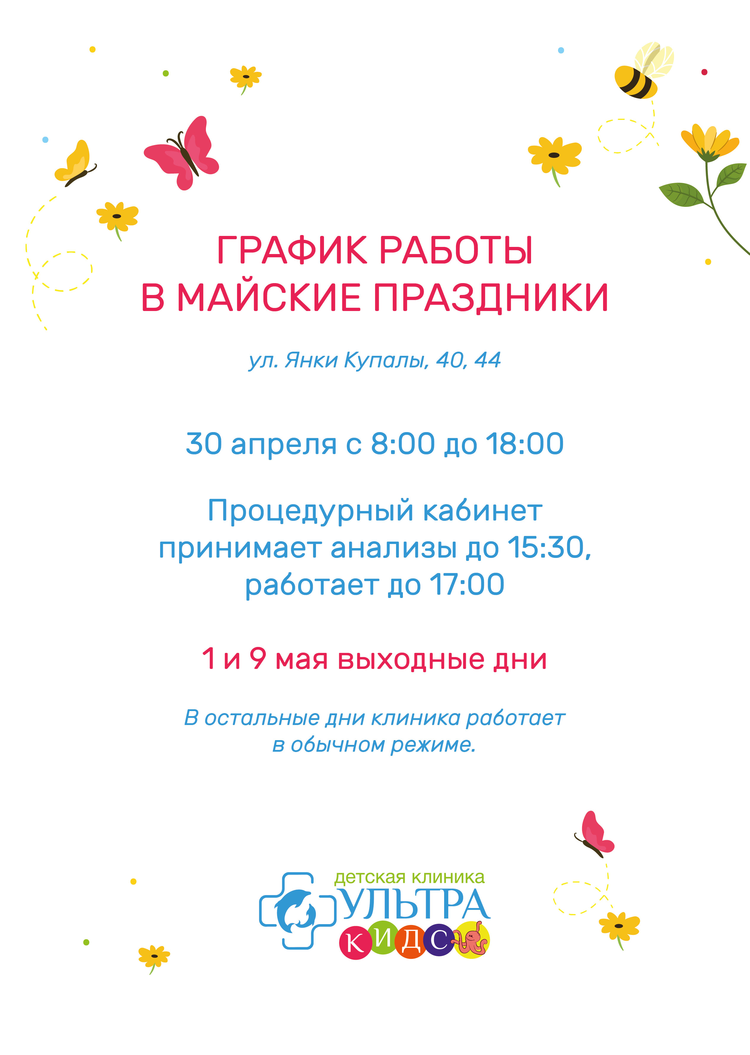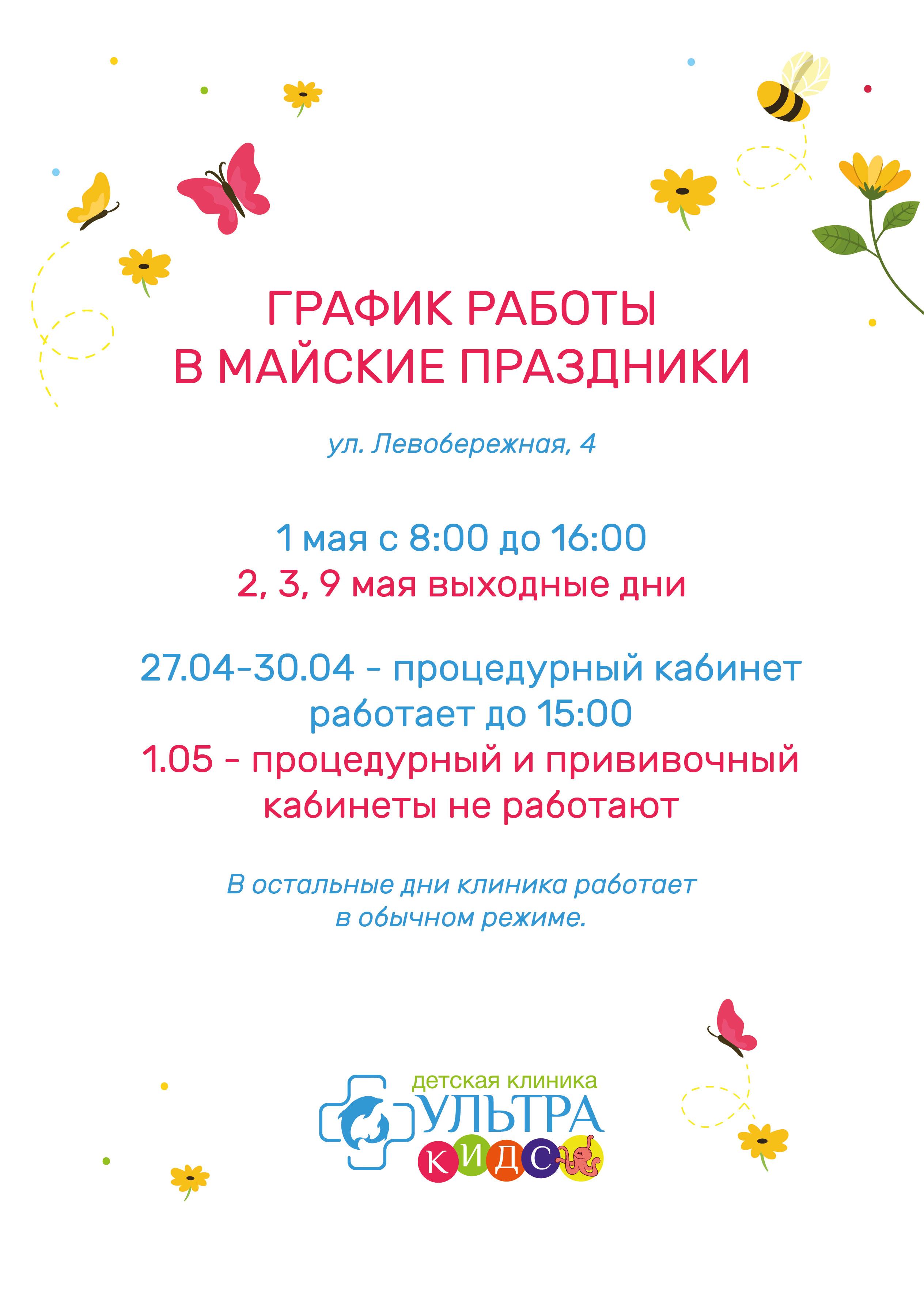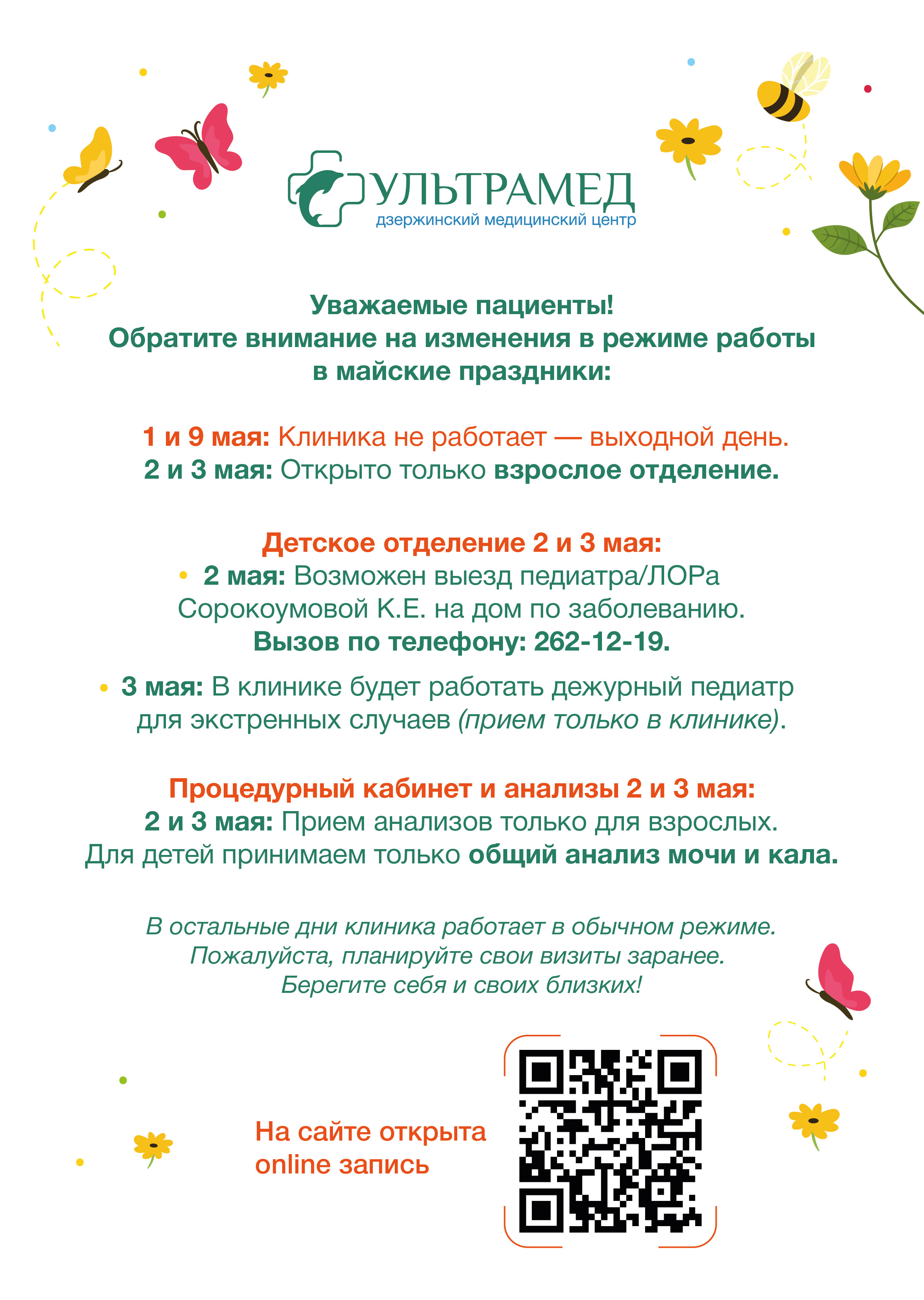 Уважаемые пациенты, ознакомьтесь с режимом работы сети клиник «УльтраМед» на майские праздники 2026.